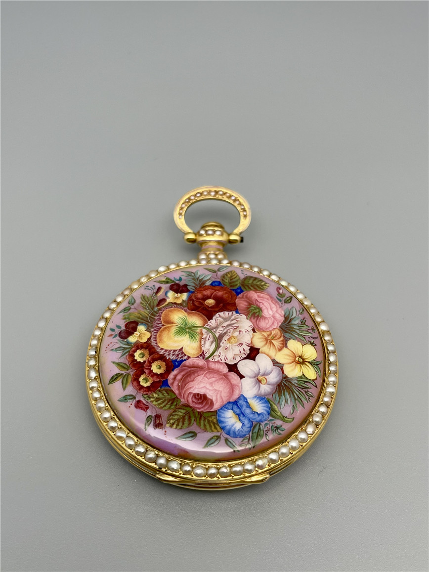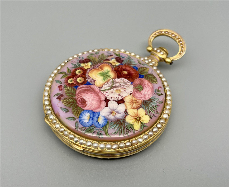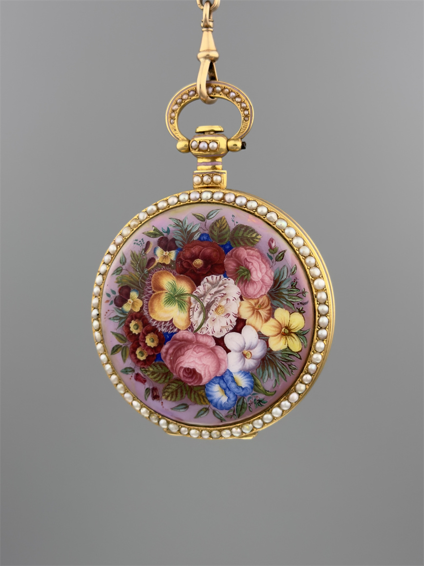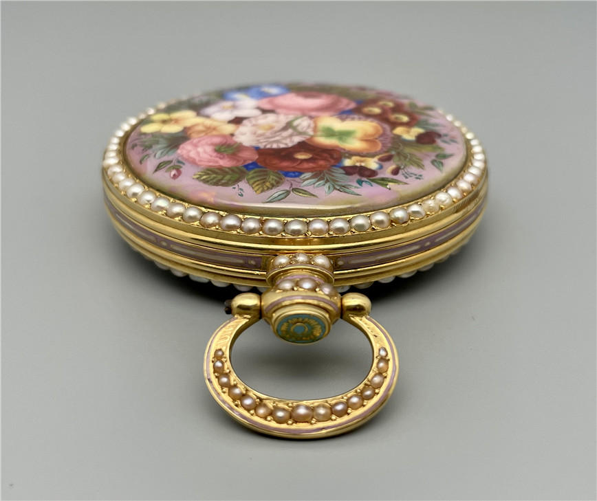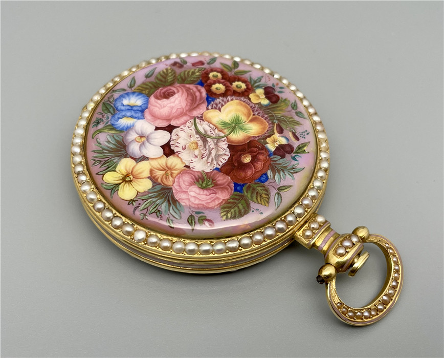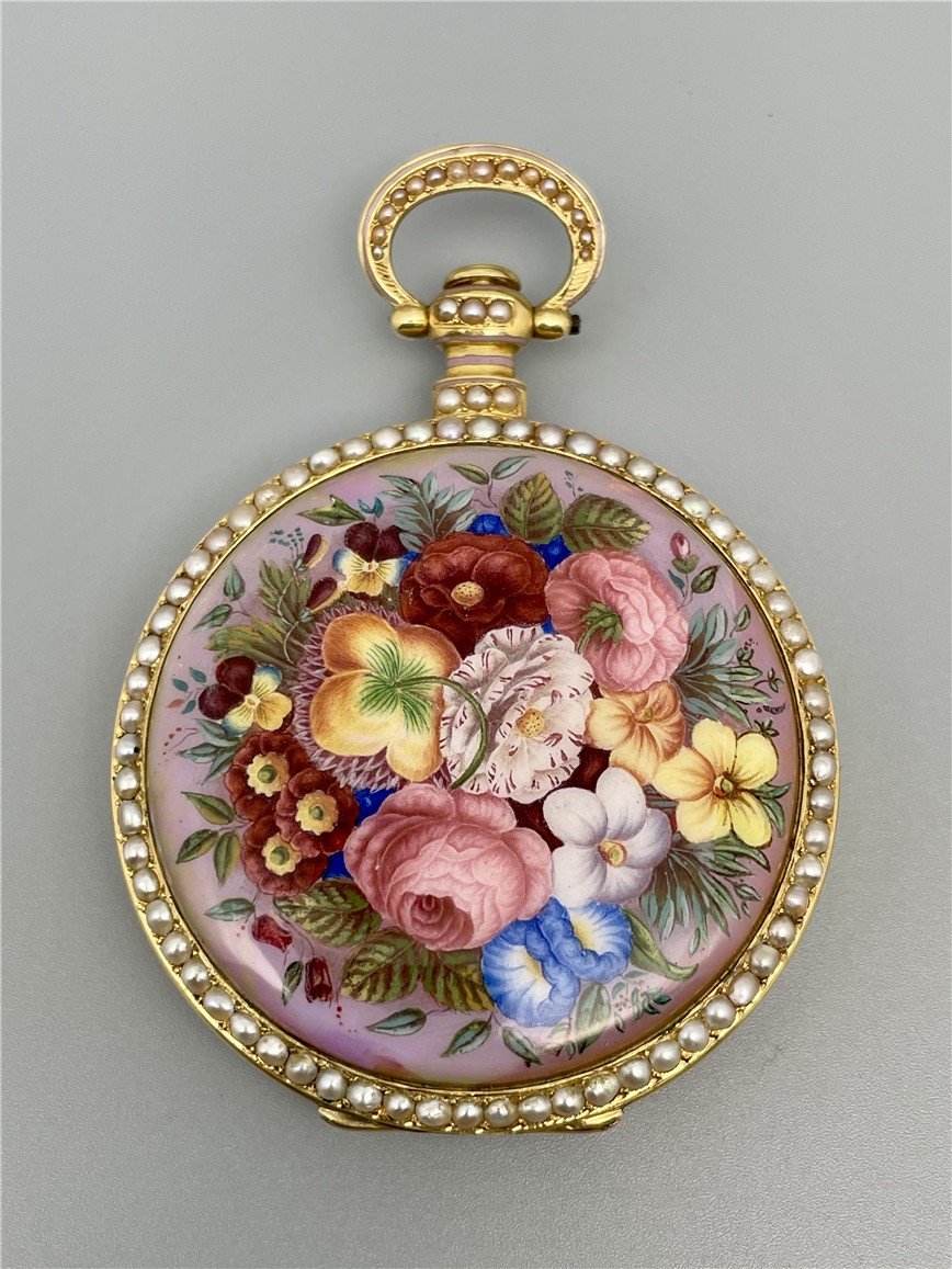 富硕,弗洛里耶,中国市场黄金珐琅珍珠怀表,约1840年代,为中国市场制作,口径55mm。金质表壳,品质极高的微绘百花珐琅,粉色珐琅背景,外圈和表环珍珠装饰。白色珐琅盘面,罗马字,蓝钢指针,中心秒针,外圈分钟及秒刻度,阿拉伯数字显示刻钟,盘面签名Vaucher, Fleurier。罕见的下夹板镜面抛光,上夹板镀金及雕刻装饰,部分镂空,中国式半跳秒擒纵,三臂摆轮,蓝钢摆轮螺丝,具有中国特点的蝙蝠形马尾,透明防尘盖。