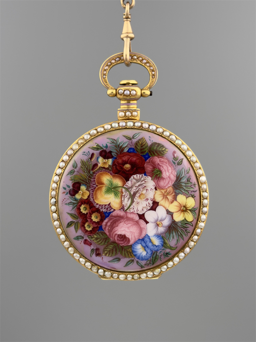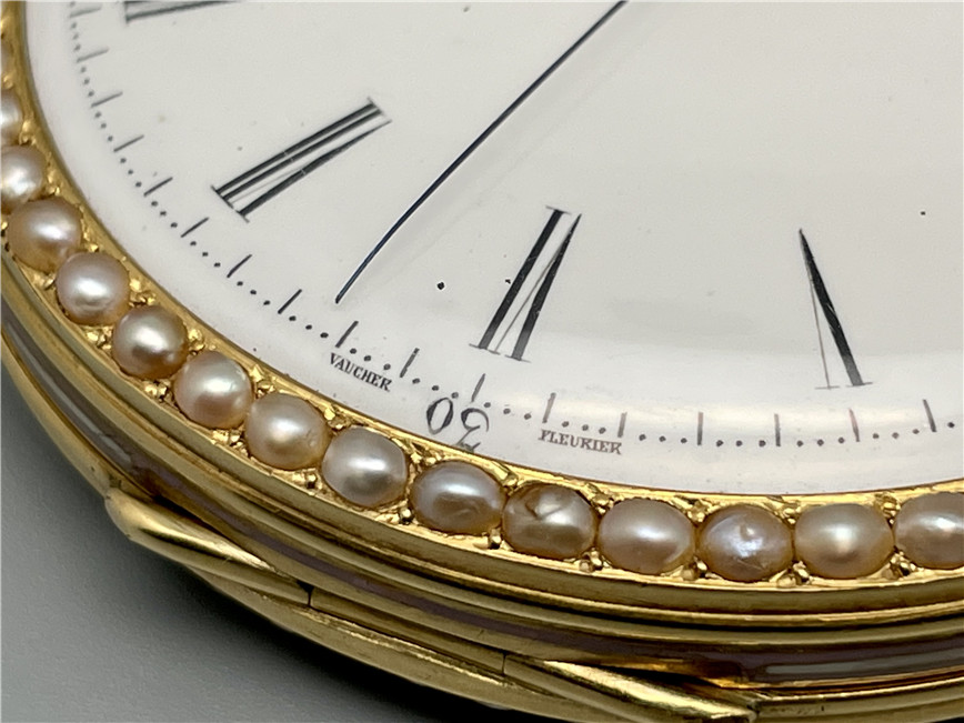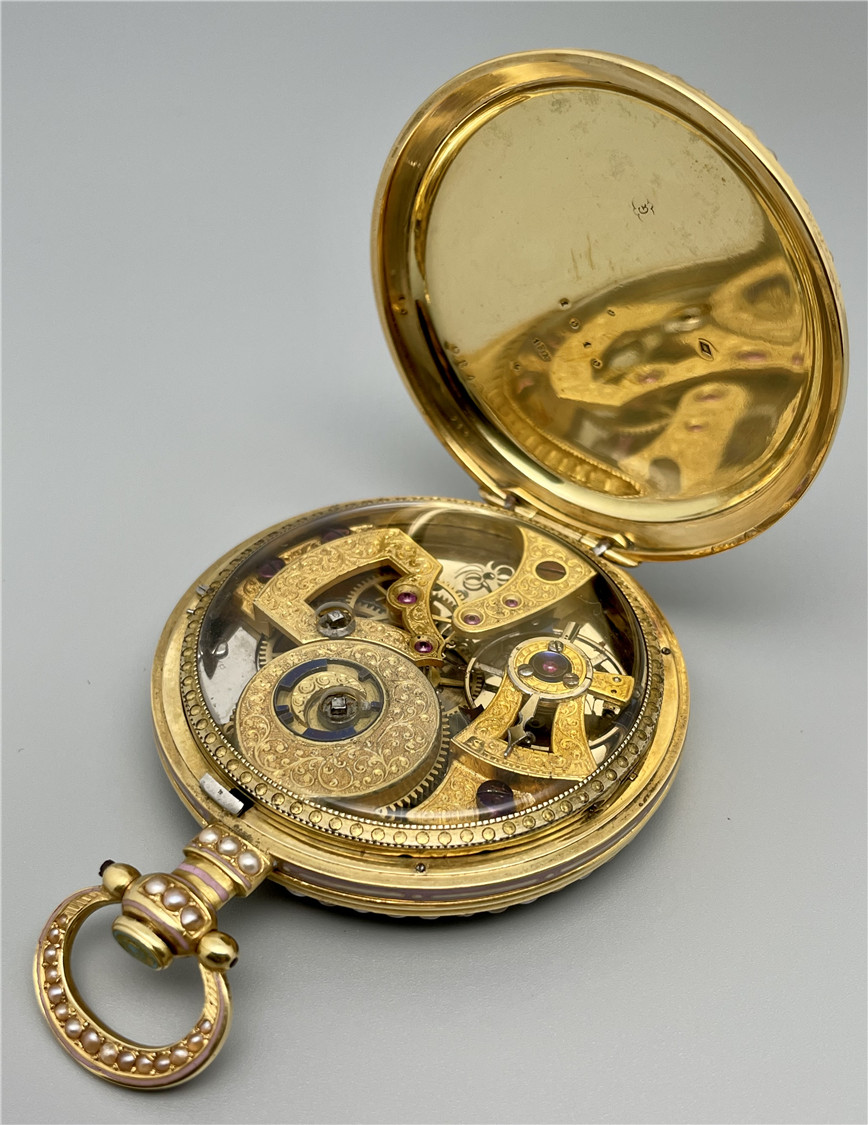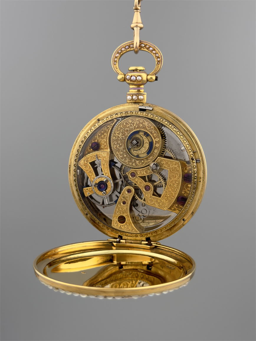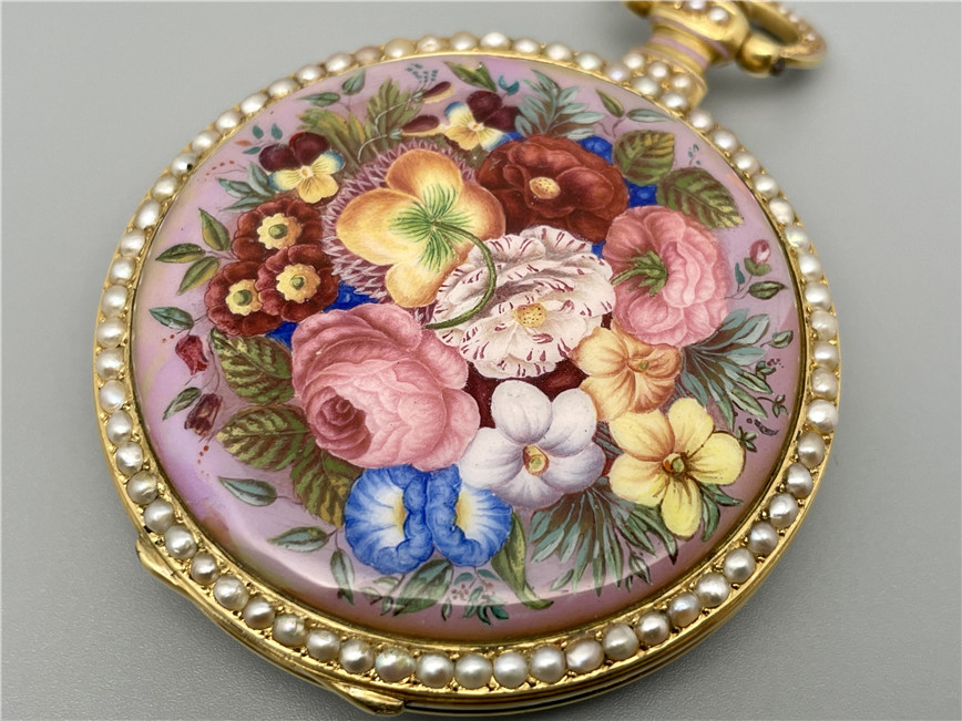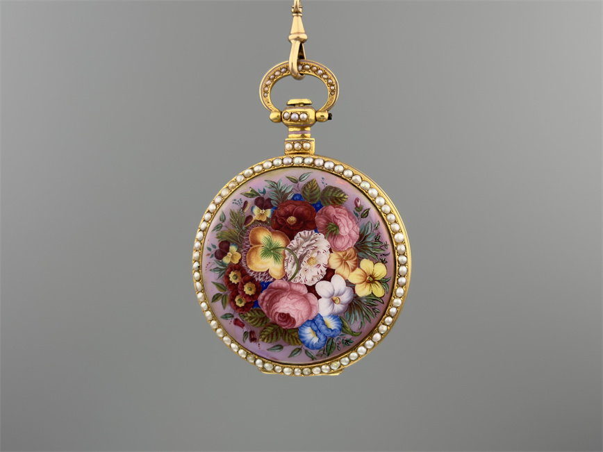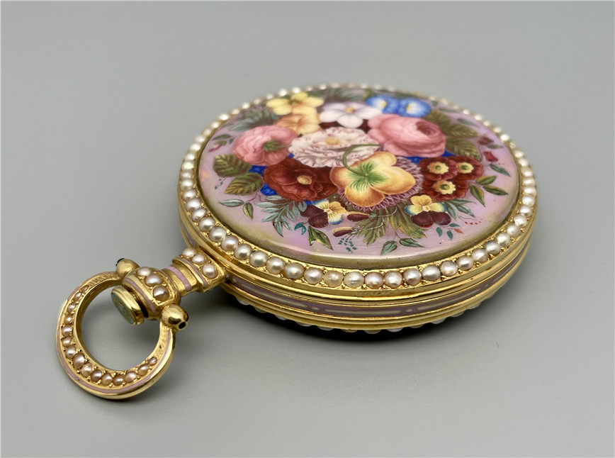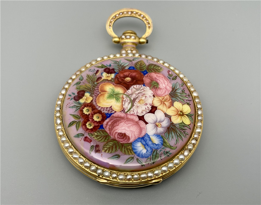 富硕,弗洛里耶,中国市场黄金珐琅珍珠怀表,约1840年代,为中国市场制作,口径55mm。金质表壳,品质极高的微绘百花珐琅,粉色珐琅背景,外圈和表环珍珠装饰。白色珐琅盘面,罗马字,蓝钢指针,中心秒针,外圈分钟及秒刻度,阿拉伯数字显示刻钟,盘面签名Vaucher, Fleurier。罕见的下夹板镜面抛光,上夹板镀金及雕刻装饰,部分镂空,中国式半跳秒擒纵,三臂摆轮,蓝钢摆轮螺丝,具有中国特点的蝙蝠形马尾,透明防尘盖。