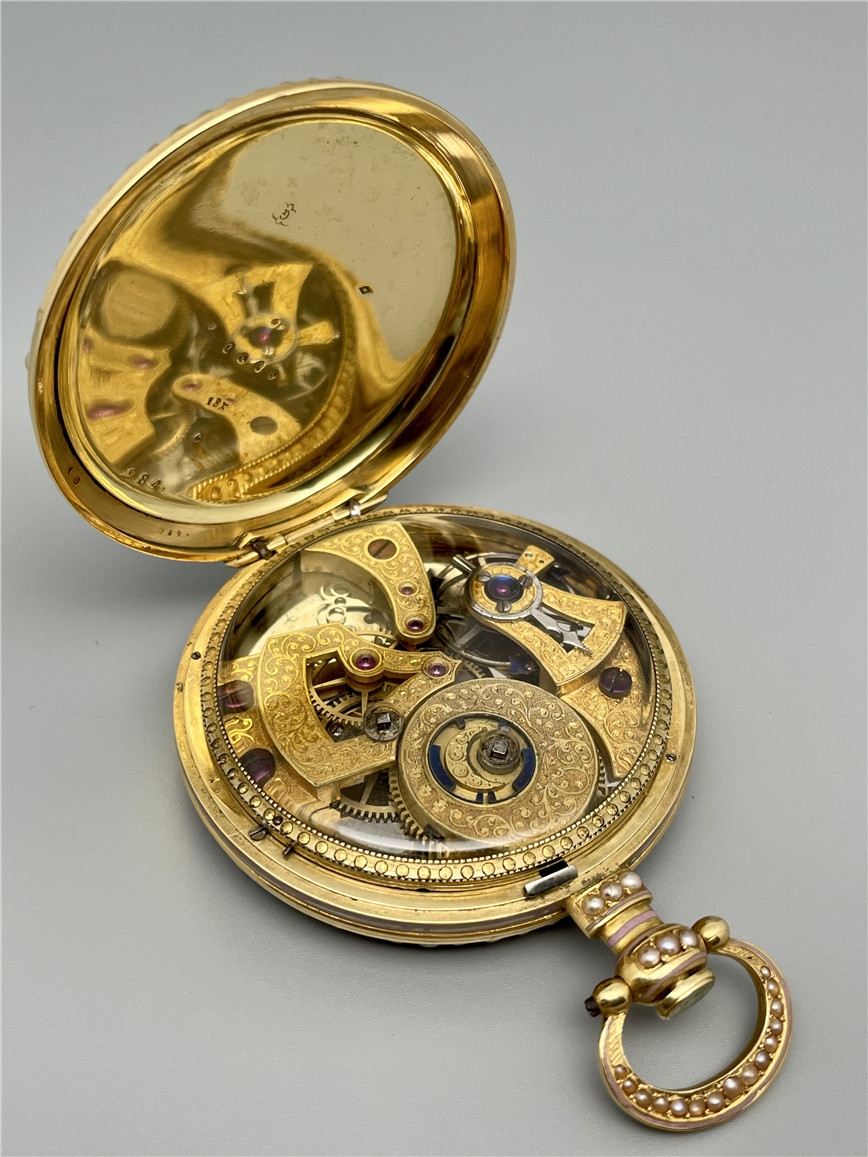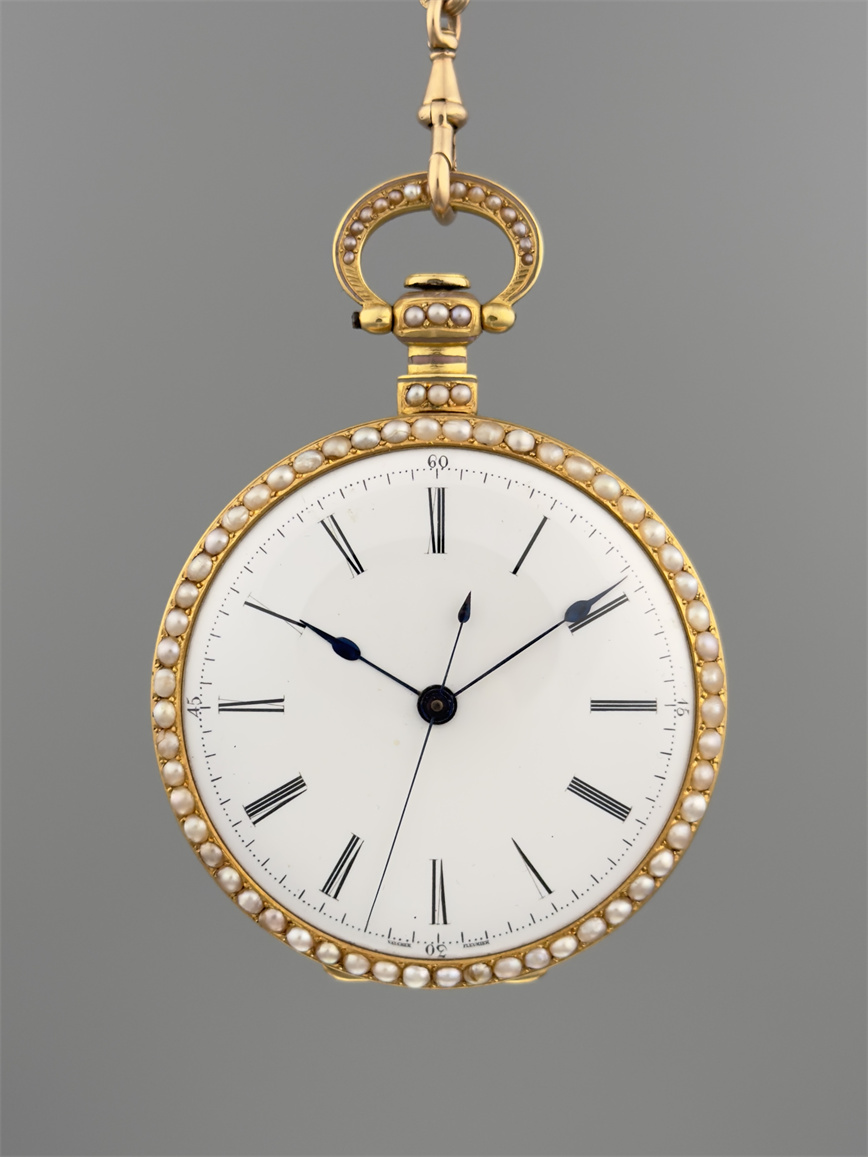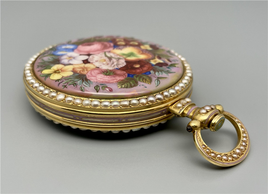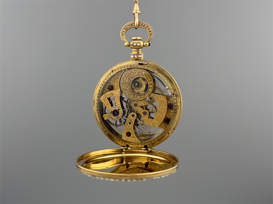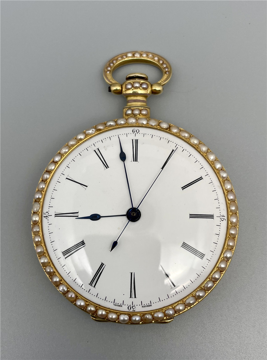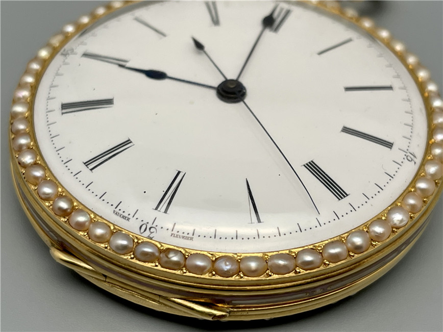 富硕,弗洛里耶,中国市场黄金珐琅珍珠怀表,约1840年代,为中国市场制作,口径55mm。金质表壳,品质极高的微绘百花珐琅,粉色珐琅背景,外圈和表环珍珠装饰。白色珐琅盘面,罗马字,蓝钢指针,中心秒针,外圈分钟及秒刻度,阿拉伯数字显示刻钟,盘面签名Vaucher, Fleurier。罕见的下夹板镜面抛光,上夹板镀金及雕刻装饰,部分镂空,中国式半跳秒擒纵,三臂摆轮,蓝钢摆轮螺丝,具有中国特点的蝙蝠形马尾,透明防尘盖。