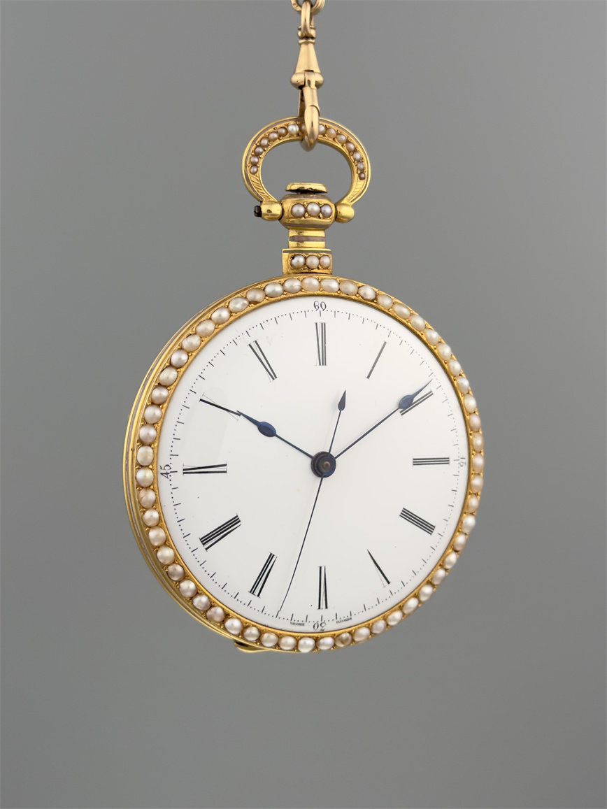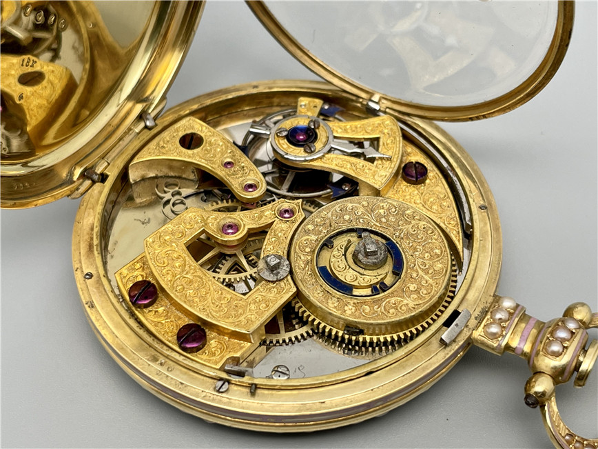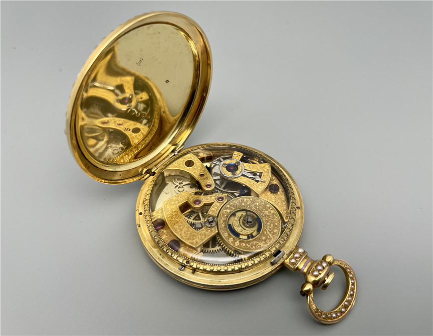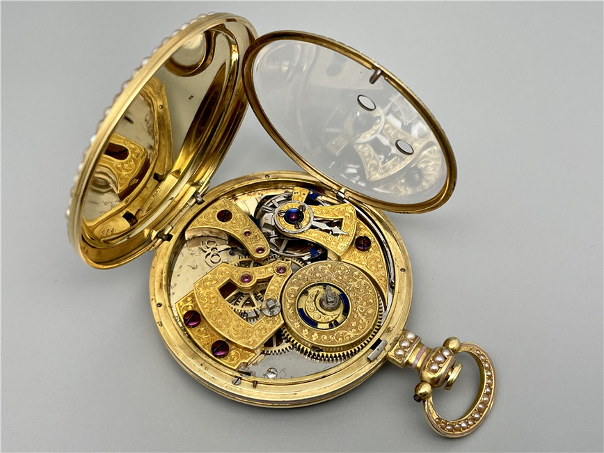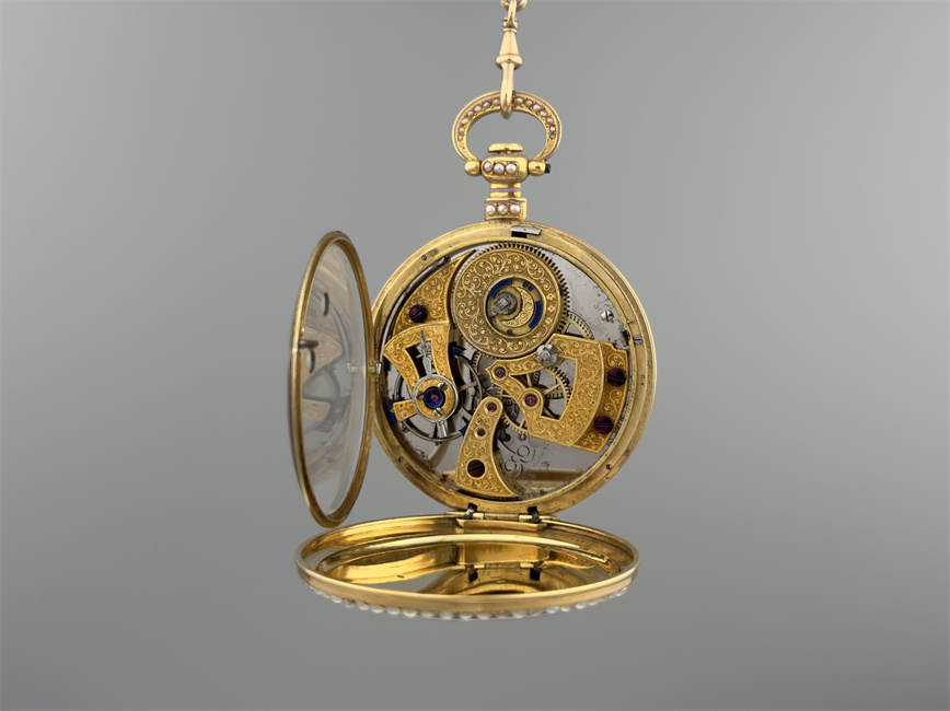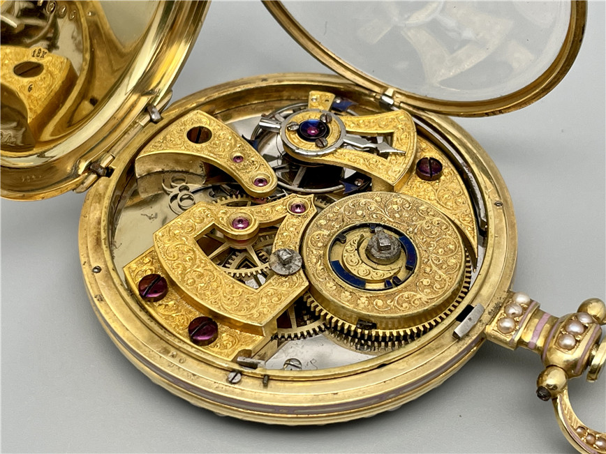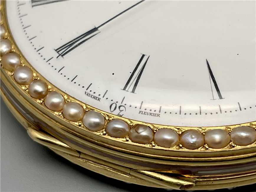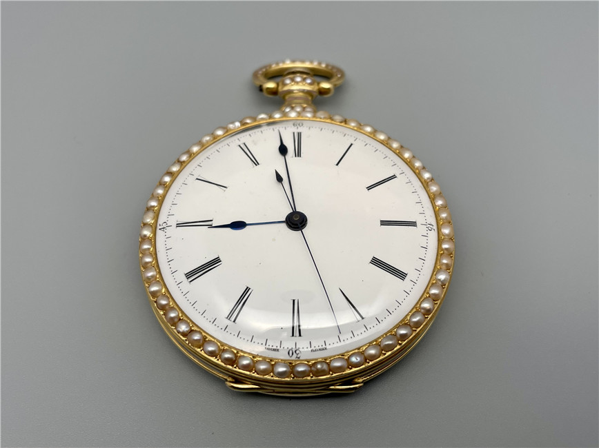 富硕,弗洛里耶,中国市场黄金珐琅珍珠怀表,约1840年代,为中国市场制作,口径55mm。金质表壳,品质极高的微绘百花珐琅,粉色珐琅背景,外圈和表环珍珠装饰。白色珐琅盘面,罗马字,蓝钢指针,中心秒针,外圈分钟及秒刻度,阿拉伯数字显示刻钟,盘面签名Vaucher, Fleurier。罕见的下夹板镜面抛光,上夹板镀金及雕刻装饰,部分镂空,中国式半跳秒擒纵,三臂摆轮,蓝钢摆轮螺丝,具有中国特点的蝙蝠形马尾,透明防尘盖。