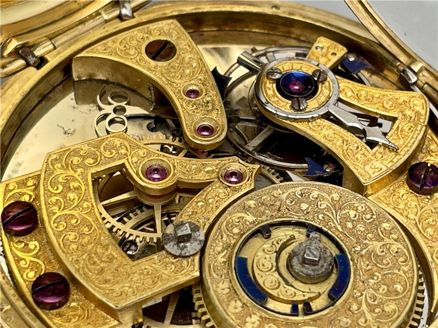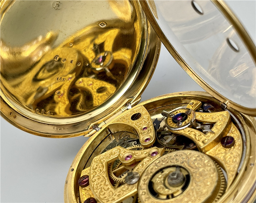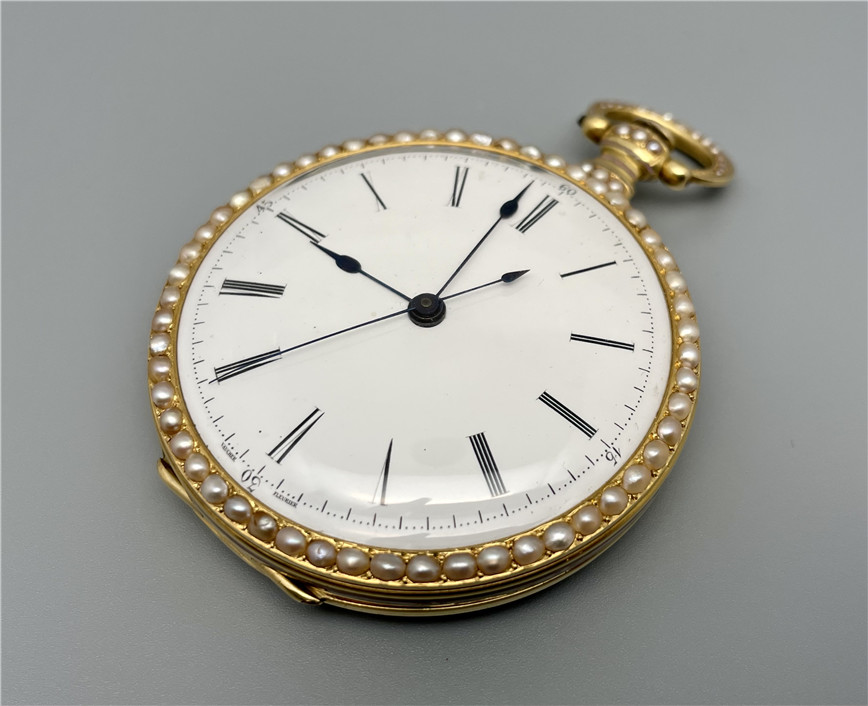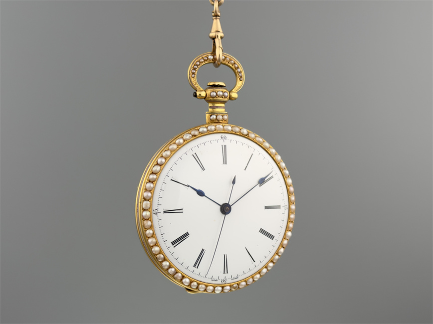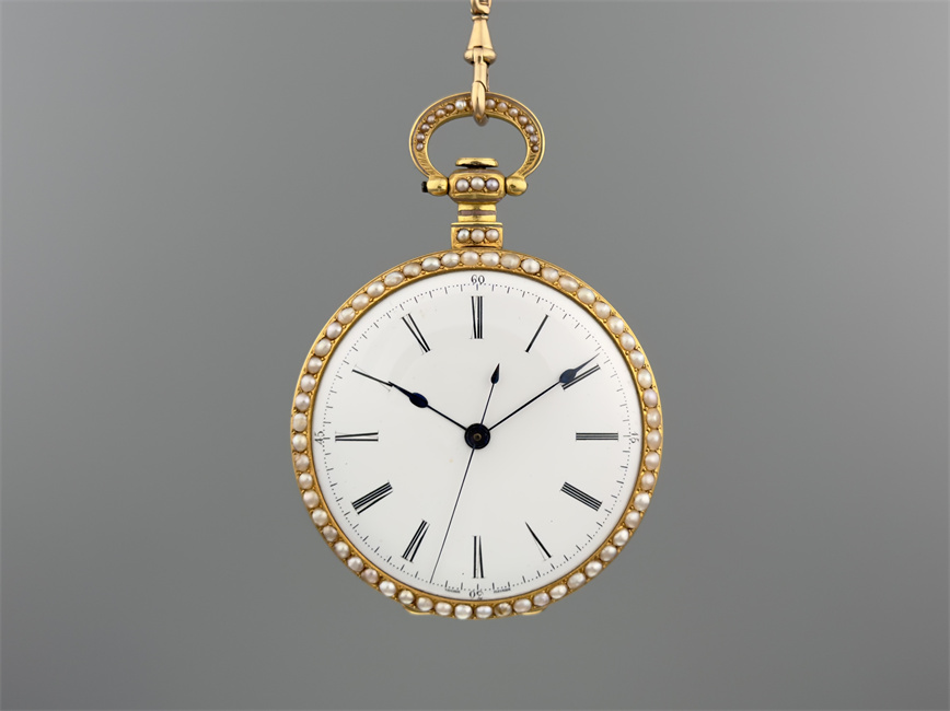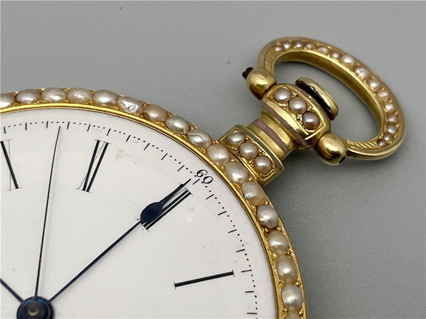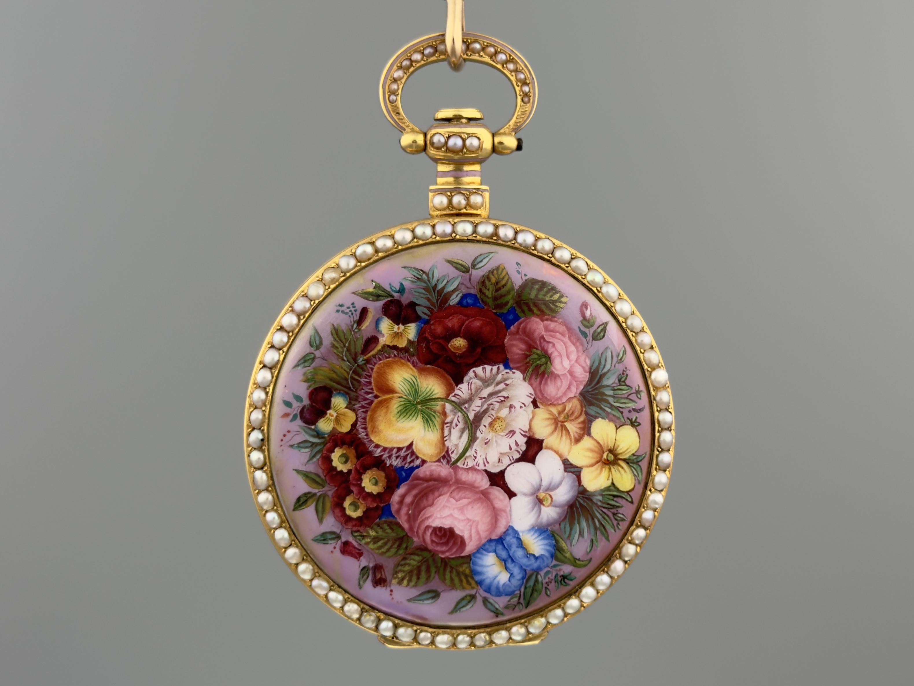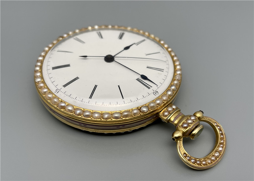 富硕,弗洛里耶,中国市场黄金珐琅珍珠怀表,约1840年代,为中国市场制作,口径55mm。金质表壳,品质极高的微绘百花珐琅,粉色珐琅背景,外圈和表环珍珠装饰。白色珐琅盘面,罗马字,蓝钢指针,中心秒针,外圈分钟及秒刻度,阿拉伯数字显示刻钟,盘面签名Vaucher, Fleurier。罕见的下夹板镜面抛光,上夹板镀金及雕刻装饰,部分镂空,中国式半跳秒擒纵,三臂摆轮,蓝钢摆轮螺丝,具有中国特点的蝙蝠形马尾,透明防尘盖。